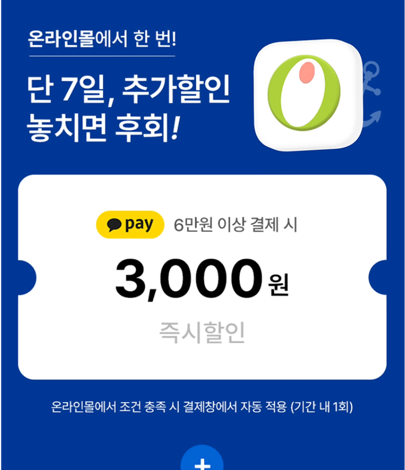 올리브영과 카카오 페이가 손을 잡고 온라인 몰에서 카카오 페이로(6만 원 이상) 결제 시 3000원 즉시할인쿠폰이 지급.