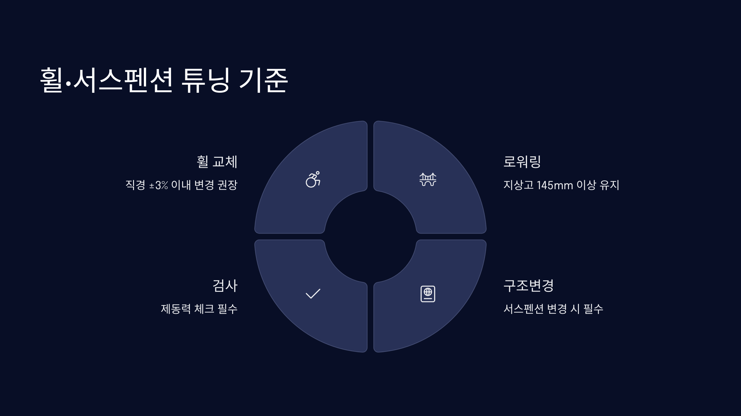 휠이나 서스펜션 튜닝은 시각적 효과도 크고, 승차감까지 바꿀 수 있어서 많이들 시도하죠. 하지만 차체 안전성에 직결되기 때문에 규제가 꽤 엄격해요. 무작정 바꾸면 위험하답니다.